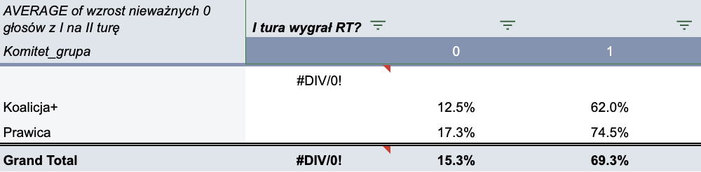 Średni wzrost nieważnych głosów bez ‘X’ (tzn. pustych kart) z I na II turę, w zależności od tego czy I turę wygrał Trzaskowski (kolumny), i w podziale na grupę Przewodniczącego Komitetu